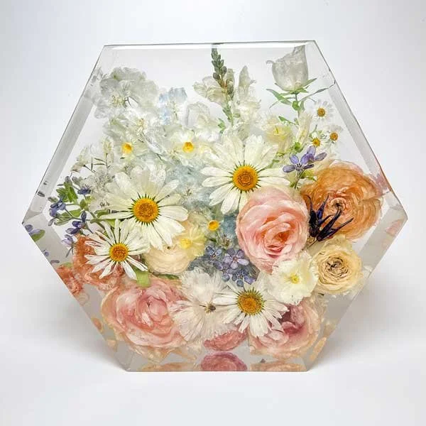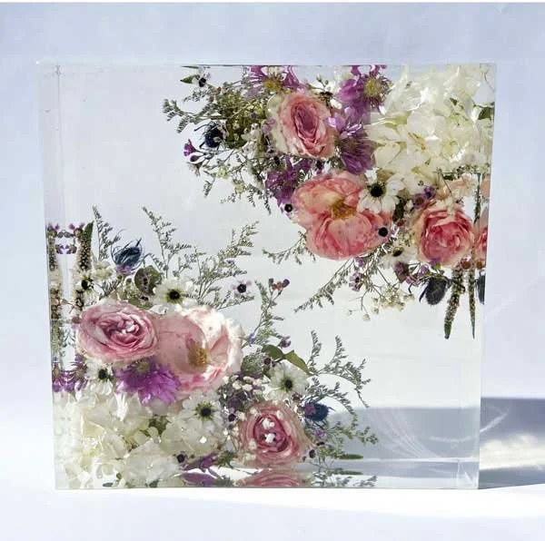 I specialise in both wedding bouquet preservation and memorial flower preservation, turning fresh flowers into treasured keepsakes that can be admired for years to come. Each piece is handcrafted with love, combining delicate drying methods with crystal-clear resin to create stunning blocks and displays.